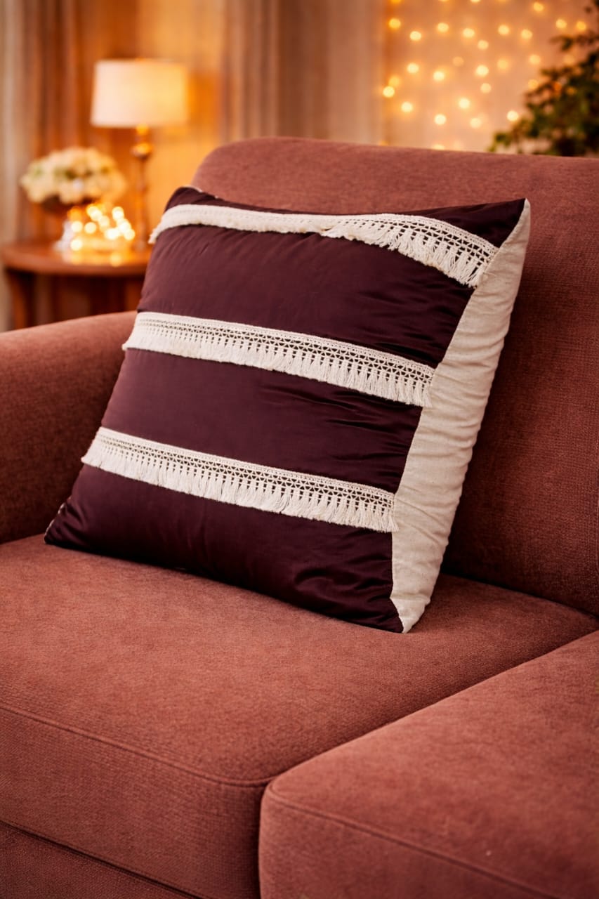 Bring home timeless elegance with Mini Saheli’s Classic Lace Cushion Cover. Designed to elevate your living space, this cushion cover features a rich dark tone paired with delicate lace detailing, creating a soft yet luxurious look. Crafted from premium-quality fabric, it offers a smooth texture, neat finishing, and long-lasting comfort. The light-toned back balances the design beautifully, making it suitable for both modern and classic interiors. Styled on a couch with soft florals, this cushion cover adds warmth, calmness, and a sophisticated charm to your home décor.